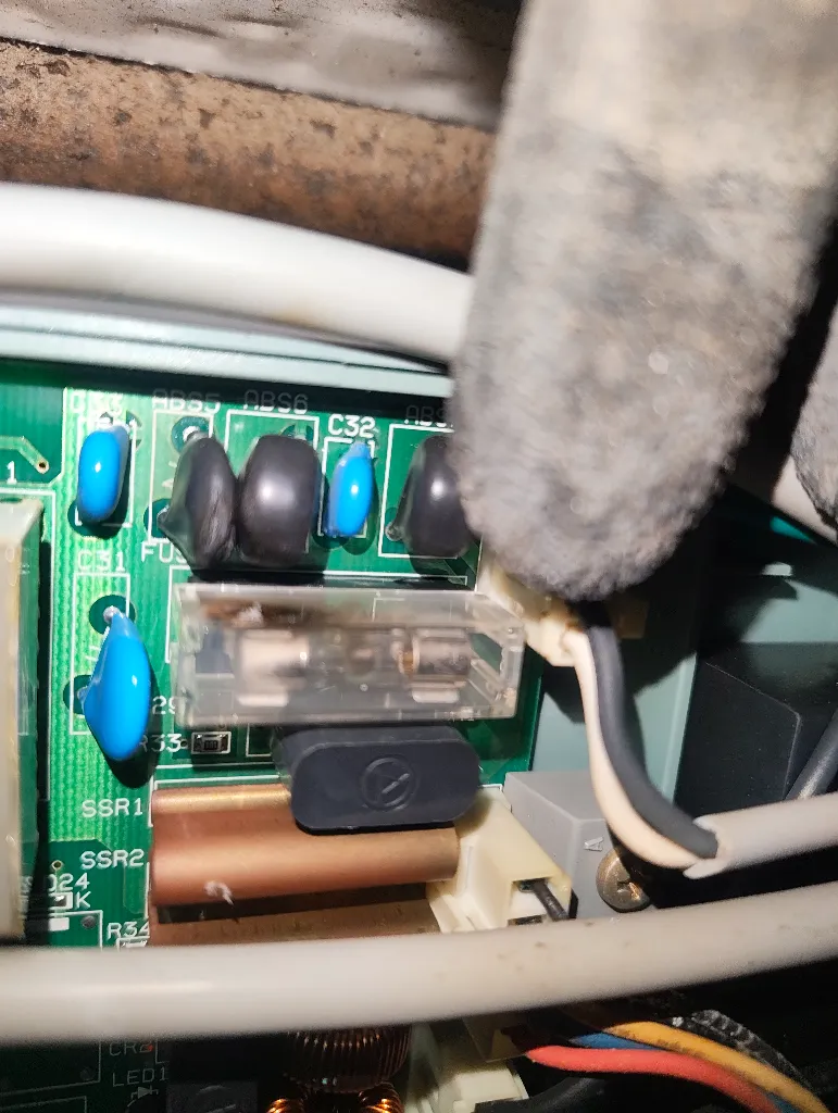 拡大写真、解り難いですがヒューズの上の黒い楕円形の部品、こちらが破断・発火した痕跡があります。